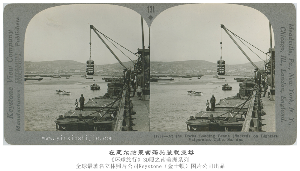 在这里,我们只看到它的一种农产品-豆子。因为这些大型货船的吃水不太近,所以这些货物从瓦尔帕莱索的码头被装载到驳船上,然后由驳船拖运到大型远洋货船上。尽管在1912年开始了一项大规模的包括建造大约1000英尺长防波堤和2000英尺长码头围墙的改进计划,为常年吃水较大的船只提供一个安全的港口,而这个海湾仍然几乎是一个开放的港口。